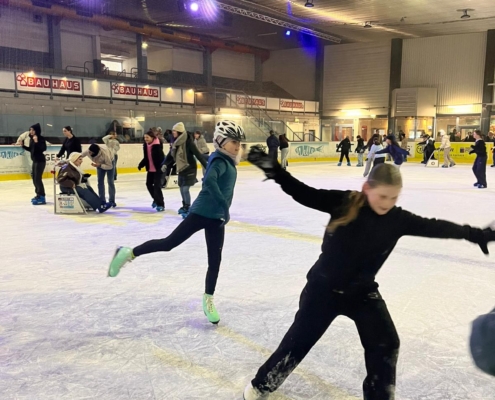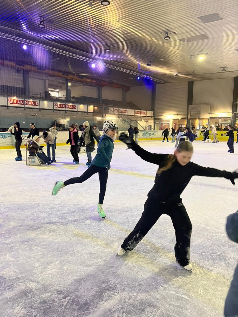 Nach dem Ausleihen der Schlittschuhe ging es voller Vorfreude direkt aufs Eis. Während geübte Läuferinnen und Läufer bereits sicher ihre Runden drehten, Rückwärtsfahren übten oder mit beeindruckenden Bremsmanövern glänzten, tasteten sich andere zunächst vorsichtig an die Eisfläche heran. Dank hilfreicher Tipps und ermutigender Unterstützung durch ihre Mitschülerinnen und Mitschüler gewannen auch die Unsicheren schnell an Vertrauen: Was anfangs noch am Geländer begann, endete schließlich in fröhlichen und angstfreien Runden über das Eis.