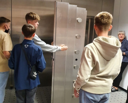 In der anschließenden Besichtigung durfte hinter die Kulissen der Sparkasse geschaut werden. Besonders interessant war hierbei der Kassenraum, in dem u.a. ausländische Währung sowie Goldunzen und Silbermünzen gelagert werden. Auch der Tresorraum mit seiner mächtigen Stahltür und den vielen Sicherheitsregulatorien rief Erstaunen hervor. Zum Abschluss wurde ein Quiz durchgeführt. Die Gewinner erhielten für ihre Aufmerksamkeit tolle Preise.